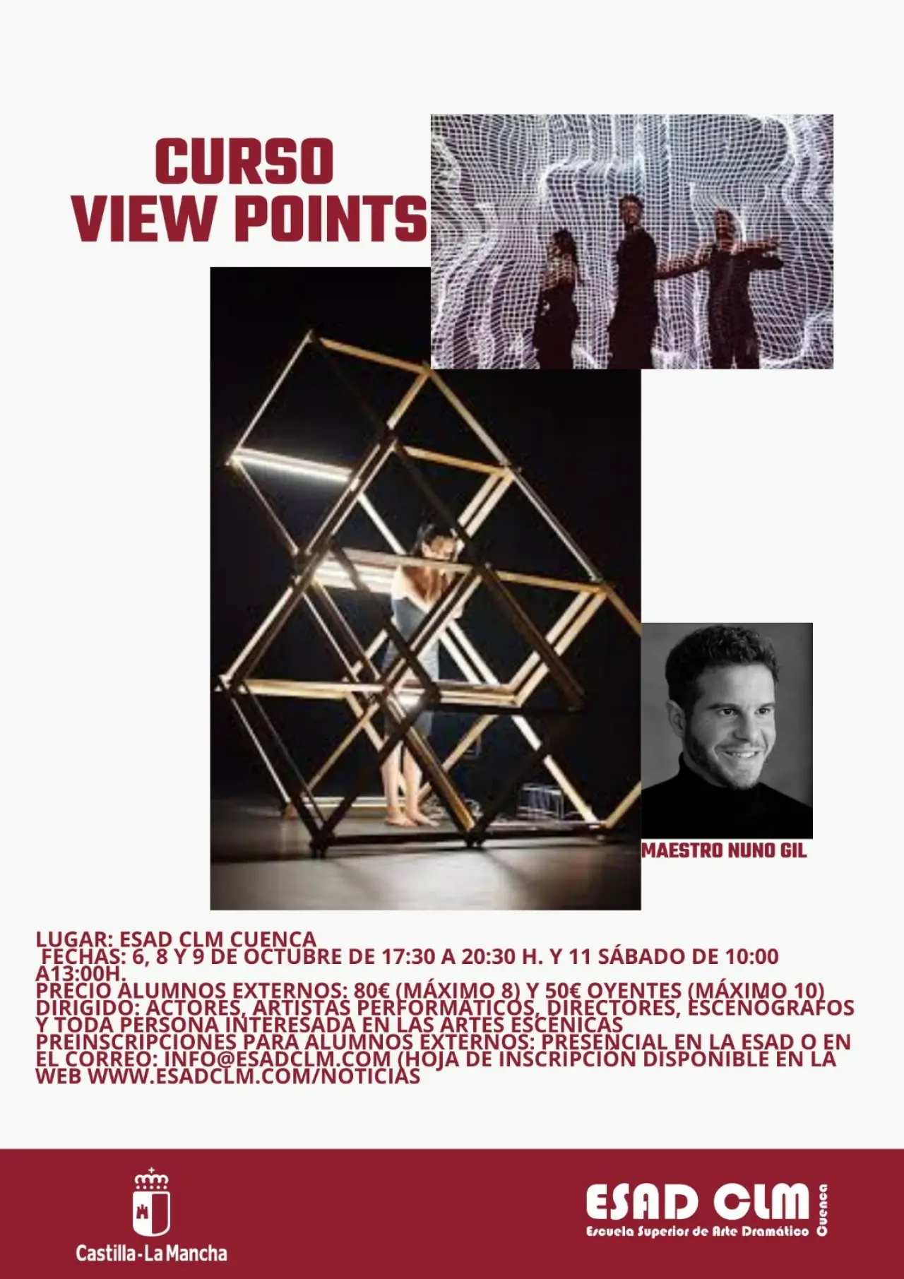 Taller de View Points impartido por el maestro Nuno Gil en el Teatro de la ESAD CLM de Cuenca, entre el lunes 6 y el sábado 11 de octubre de 2025. Dirigido a alumnos de la ESAD CLM (80 % de plazas reservadas), actores, artistas performáticos, directores, escenógrafos y otros interesados y profesionales de las AAEE. Preinscripción presencial en conserjería o en el correo info@esadclm.com. Precio para alumnos externos, 80€; para oyentes, 50€.