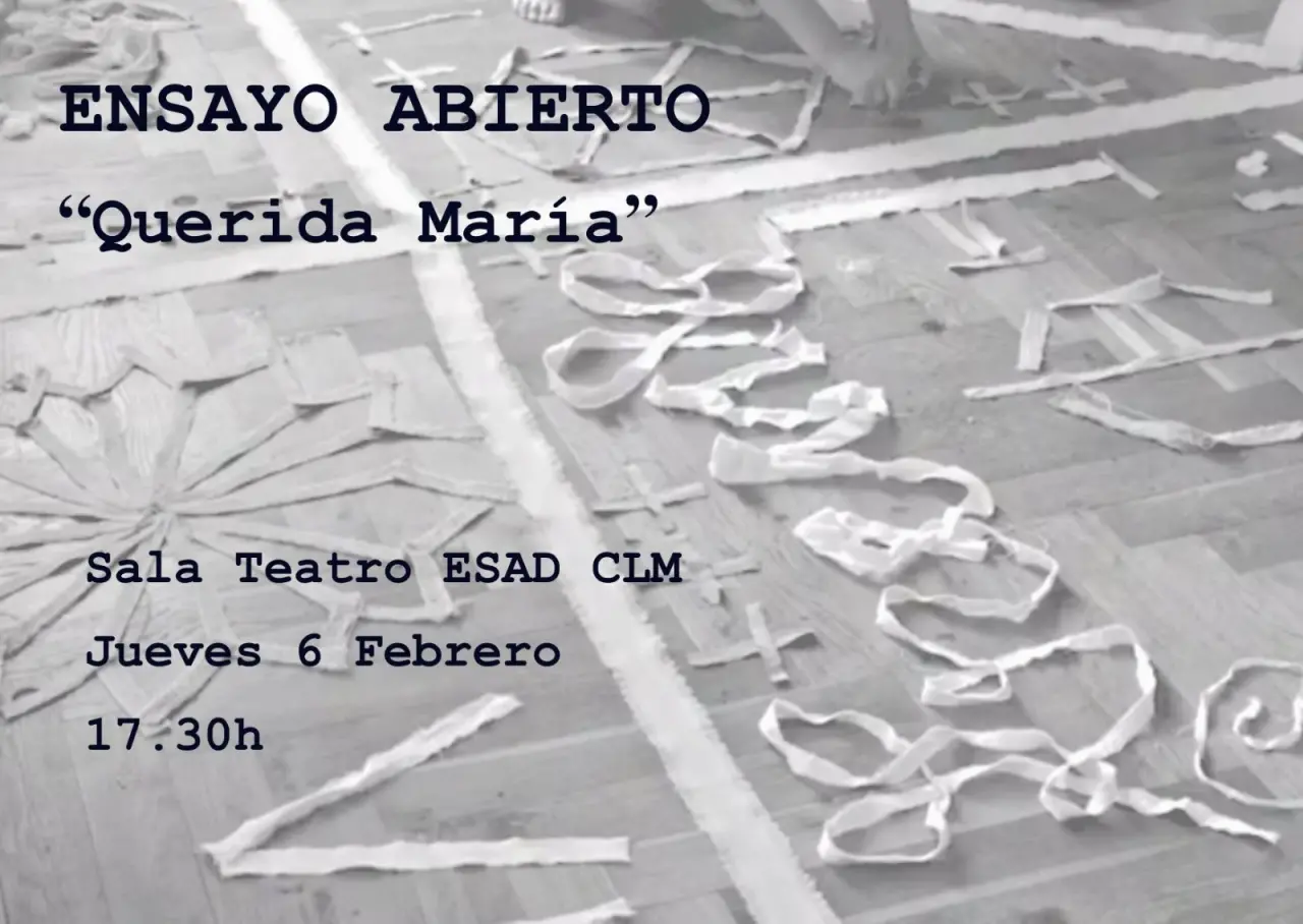 Los alumnos que lo deseen podrán asistir este jueves a las 17:30 h. en el teatro de la ESAD al ensayo abierto de la performa "Querida María" creada por Marina Álvarez Carnero (Facultad Bellas Artes Cuenca), Beatriz Morales Manzanaro ( Facultad Bellas Artes Cuenca) y Nora Osma Valiente (ESAD CLM) con motivo de su participación en el XVIIII Festival Internacional de Teatro Universitario Universidad de Santiago de Compostela.