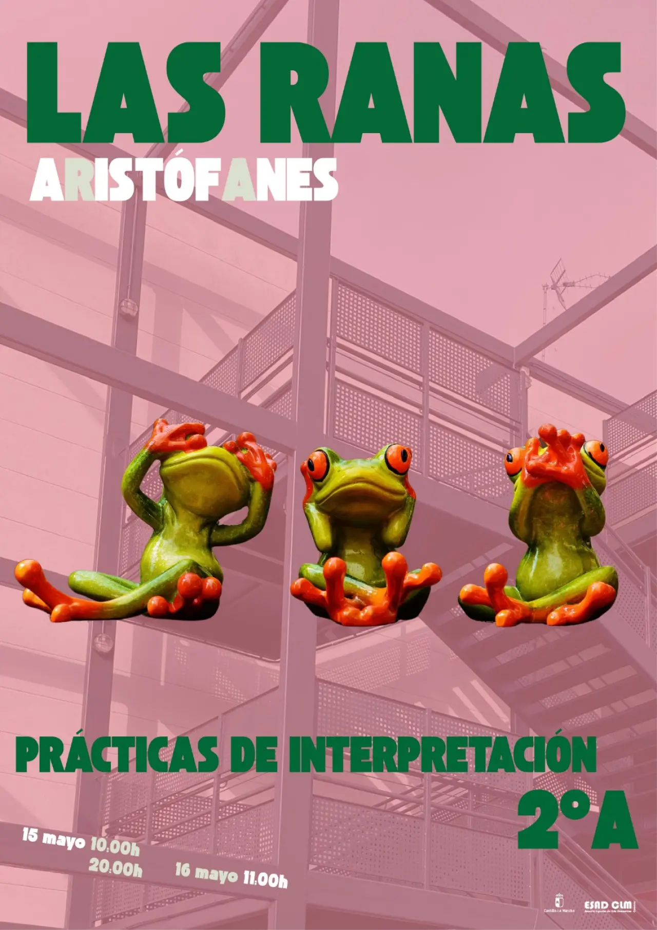 Las ranas, de Aristófanes. Muestra final de Prácticas de Interpretación de 2º A. Profesora Patricia González. Jueves 15 a las 10:00 h., en el Teatro de la ESAD CLM y a las 20:00 h en el Escenario al Aire Libre, patio de la ESAD CLM. Entrada libre mediante reserva hasta completar aforo.